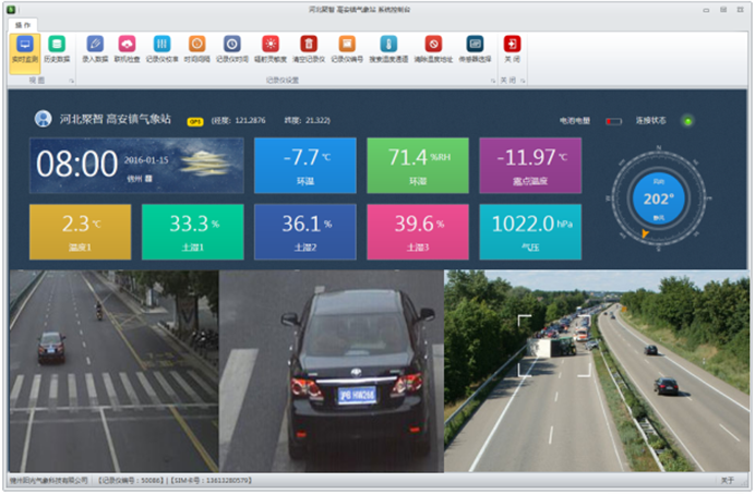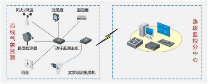 系統(tǒng)由高速公路自動氣象站、數(shù)據(jù)傳輸、數(shù)據(jù)處理應(yīng)用中心和道路道路監(jiān)控等部分組成。高速公路自動氣象站可以觀測的氣象要素包括常規(guī)氣象要素(風(fēng)、溫、濕、雨、壓)、能見度和路面狀況(路面溫度、干濕狀況、雪、結(jié)冰等)。