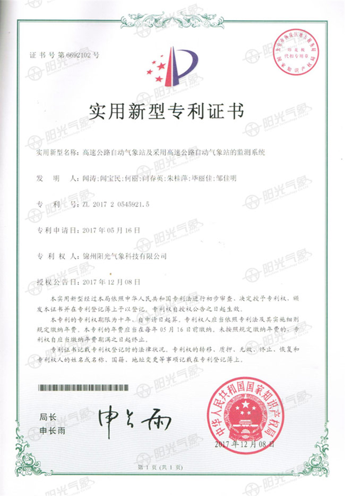 今年錦州陽光在高速公路自動氣象監(jiān)測系統(tǒng)領(lǐng)域再取得新突破。2017年5月16日,由陽光氣象研發(fā)的“高速公路自動氣象站及采用高速公路自動氣象站的監(jiān)測系統(tǒng)”,獲得國家知識產(chǎn)權(quán)局實(shí)用新型專利授權(quán),授權(quán)專利號:ZL 2017 2 0545921.5。