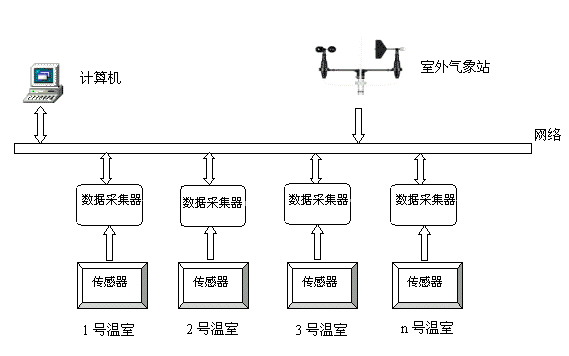 光溫室集群監(jiān)控系統(tǒng)包括:計(jì)算機(jī)、打印機(jī)、數(shù)據(jù)采集器、溫室用傳感器(溫度、濕度、光照等)、監(jiān)控軟件。