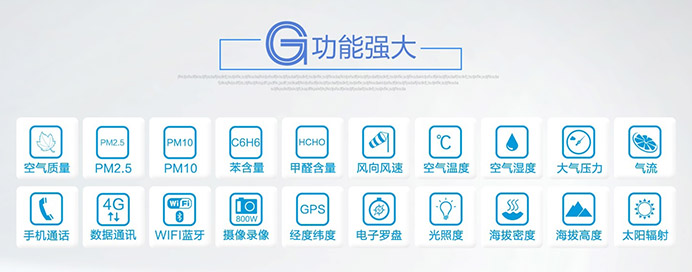 可測量要素為:風(fēng)速,風(fēng)向,氣流,環(huán)境溫度,環(huán)境濕度,氣壓,太陽輻射,紫外線強度,風(fēng)寒指數(shù),熱指數(shù),露點,海拔高度,海拔密度,位置經(jīng)度緯度,電子羅盤,時間,GPS,CO2濃度,土壤水份/溫度、雨量、熱流等(用戶可根據(jù)使用要求選配以上測量要素)。