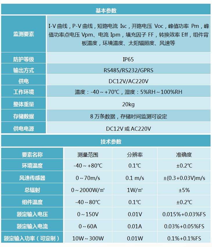 2、可測(cè)量參數(shù): I-V曲線,P-V曲線,短路電流,開路電壓,峰值功率,峰值功率點(diǎn)電壓、電流,填充因子,轉(zhuǎn)換效率,組件背板溫度,環(huán)境溫度、太陽輻照度、風(fēng)速等。