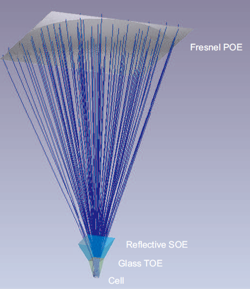 聚光光路設計中,入射光通過三級聚光部件進行聚光。其中初級光學器件(菲涅爾非成像玻璃透鏡)裝配到組件框架結(jié)構上,二三級光學器件裝配到聚光接收器模塊上。這種設計將入射接收角提高至±0.86°,同時提高光線均勻度。有效的提高了功率和效率。該光學器件及光路解決方案由德國知名光學設計公司提供。