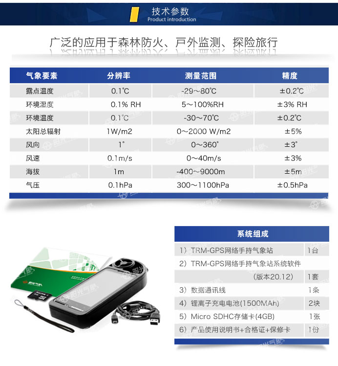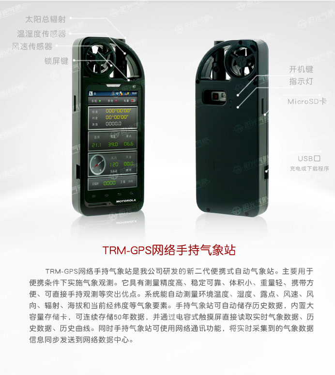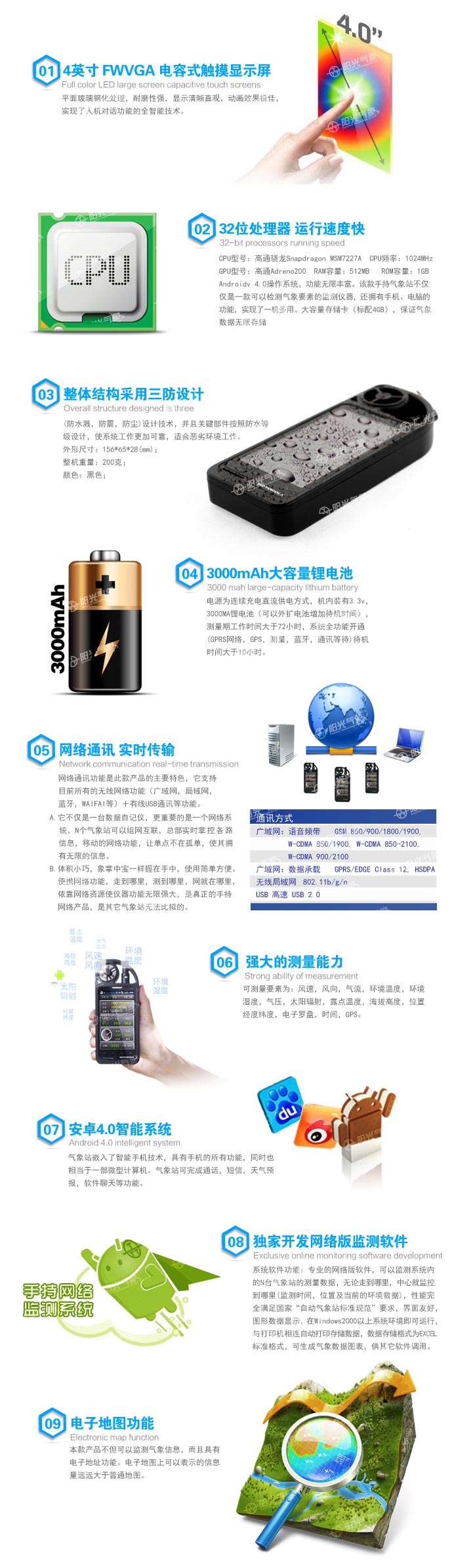 手持氣象站是我公司研發(fā)的新二代便攜式自動(dòng)氣象站。主要用于便攜條件下實(shí)施氣象觀測。它具有測量精度高、穩(wěn)定可靠、體積小、重量輕、攜帶方便、可直接手持觀測等突出優(yōu)點(diǎn)。系統(tǒng)能自動(dòng)測量環(huán)境溫度、濕度、露點(diǎn)、風(fēng)速、風(fēng)向、輻射、海拔和當(dāng)前經(jīng)緯度等氣象要素。手持氣象站可自動(dòng)儲(chǔ)存歷史數(shù)據(jù),內(nèi)置大容量存儲(chǔ)卡,可連續(xù)存儲(chǔ)50年數(shù)據(jù),并通過電容式觸摸屏直接讀取實(shí)時(shí)氣象數(shù)據(jù)、歷史數(shù)據(jù)、歷史曲線。同時(shí)手持氣象站可使用網(wǎng)絡(luò)通訊功能,將實(shí)時(shí)采集到的氣象數(shù)據(jù)信息同步發(fā)送到網(wǎng)絡(luò)數(shù)據(jù)中心。