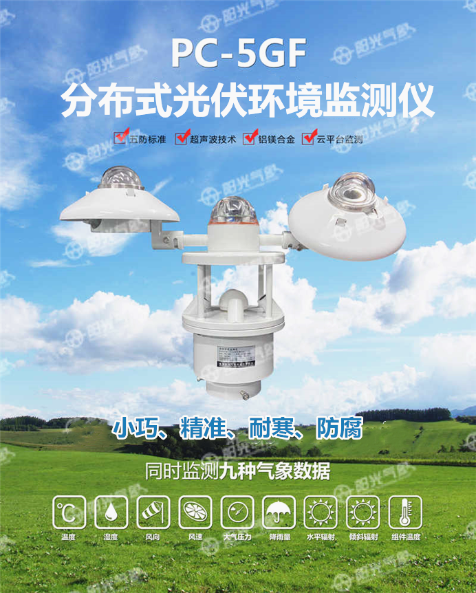 PC-5GF分布式光伏環(huán)境監(jiān)測儀是錦州陽光氣象科技有限公司自主研發(fā)的一款便于安裝、測量精度高、性能穩(wěn)定,并集成多項氣象要素為一體的具有金屬防爆外殼的環(huán)境監(jiān)測儀。本產(chǎn)品根據(jù)太陽能資源評估、太陽能系統(tǒng)監(jiān)測需要,并結(jié)合國內(nèi)外太陽能觀測系統(tǒng)的先進(jìn)技術(shù)研制而成的。