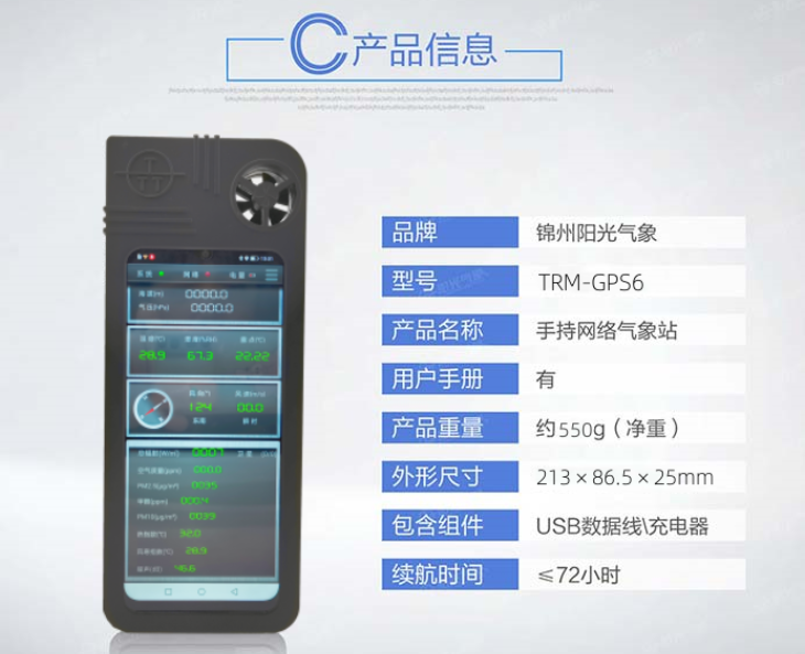 TRM-GPS6型手持氣象站是我公司研發(fā)的第四代便攜式自動(dòng)氣象站。主要用于便攜條件下實(shí)施氣象觀測(cè)。它具有測(cè)量精度高、穩(wěn)定可靠、體積小、重量輕、攜帶方便、可直接手持觀測(cè)等突出優(yōu)點(diǎn)。系統(tǒng)能自動(dòng)測(cè)量環(huán)境溫度、濕度、露點(diǎn)、風(fēng)速、風(fēng)向、輻射、空氣質(zhì)量、PM2.5、PM10、甲醛、大氣壓力、海拔、熱指數(shù)、風(fēng)寒指數(shù)、噪聲和當(dāng)前經(jīng)緯度等氣象要素。手持氣象站可自動(dòng)儲(chǔ)存歷史數(shù)據(jù),內(nèi)置大容量存儲(chǔ)卡,可連續(xù)存儲(chǔ)50年數(shù)據(jù),并通過(guò)觸摸屏直接讀取,實(shí)時(shí)將數(shù)據(jù)共享到網(wǎng)絡(luò)云數(shù)據(jù)中心(陽(yáng)光智慧云)。