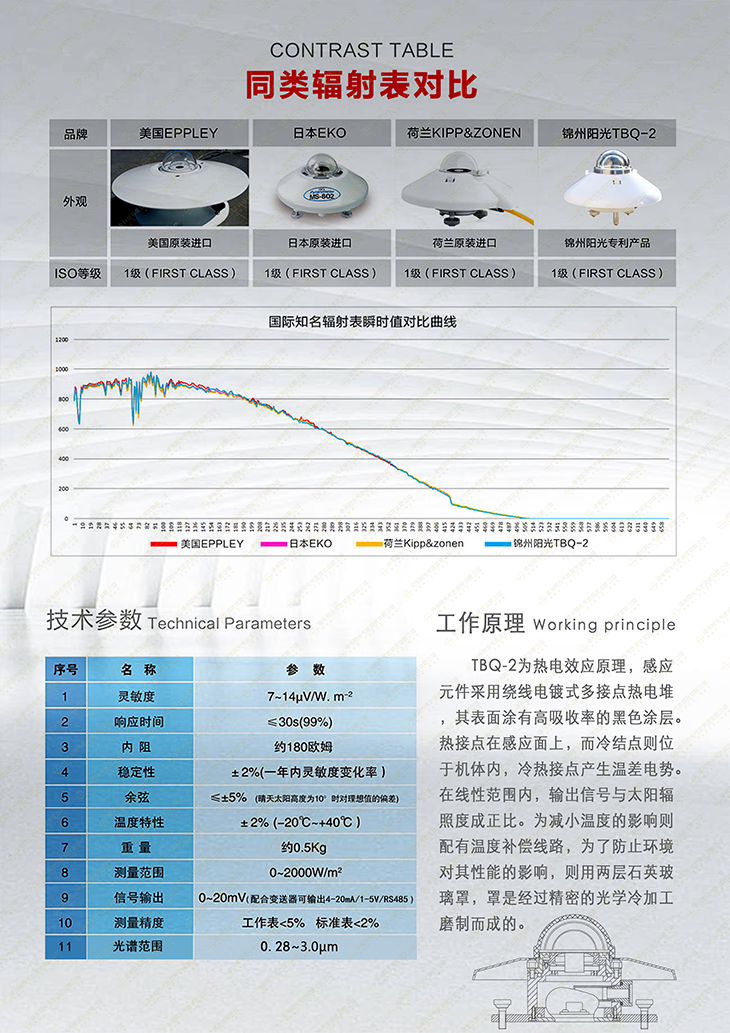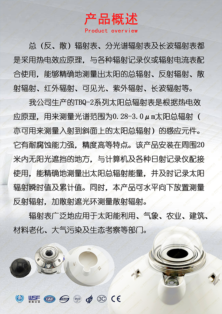 我公司生產(chǎn)的TBQ-2太陽(yáng)總輻射表是根據(jù)熱電效應(yīng)原理,用來(lái)測(cè)量光譜范圍為0.28-3.0μm太陽(yáng)總輻射(亦可用來(lái)測(cè)量入射到斜面上的太陽(yáng)總輻射)的感應(yīng)元件。它有耐腐蝕能力強(qiáng),精度高等特點(diǎn)。