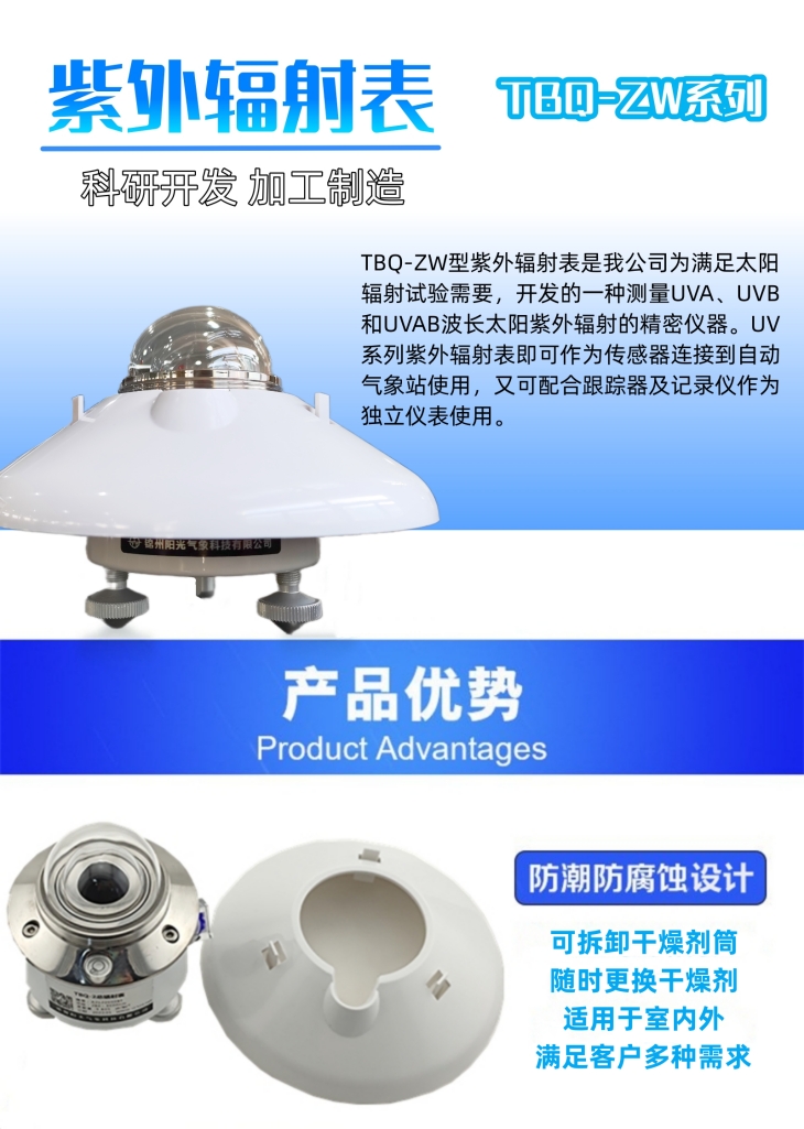 TBQ-ZW型紫外輻射表是我公司為滿足太陽輻射試驗的需要,開發(fā)的一種測量UVA、UVB和UVAB波長太陽紫外輻射的精密儀器。UV系列紫外輻射表即可作為傳感器連接到自動氣象站使用,又可配合跟蹤器及記錄儀作為獨立儀表使用。