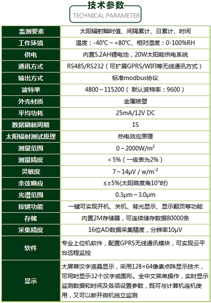 TBQ-2W太陽輻射儀是陽光氣象公司研發(fā)生產(chǎn)的手持輻射儀,它具有體積小、重量輕、精度高、性能穩(wěn)定等特點(diǎn),這款產(chǎn)品集監(jiān)測、顯示、存儲、通訊等功能于一體,是一款能手持監(jiān)測的太陽輻射儀。TBQ-2W的研發(fā)解決了常規(guī)手持輻射儀測量精度低,而高精度輻射產(chǎn)品又系統(tǒng)龐大的問題。另外本產(chǎn)品采用了防腐、防爆、防水、防震、防塵等高防護(hù)級別的設(shè)計理念,可滿足各種特殊環(huán)境的使用需求,是軍事、航海、科研等領(lǐng)域產(chǎn)品。