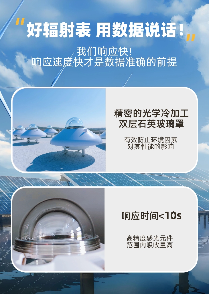 2、響應(yīng)快:響應(yīng)時(shí)間≤10S,對(duì)太陽(yáng)輻射的微小變化都能迅速響應(yīng),確保數(shù)據(jù)的實(shí)時(shí)性和準(zhǔn)確性。